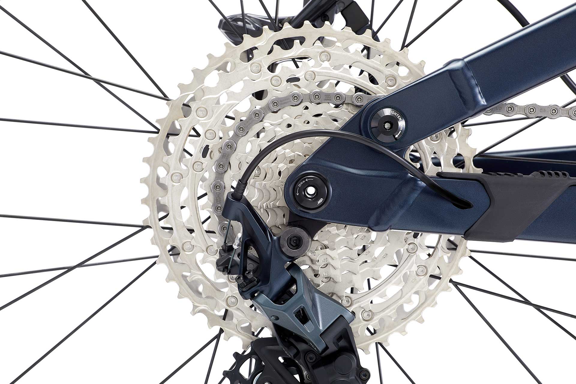後輪のアクスルに、12x148mm アクスルを使います。このスルーアクスルは、大きな利点を2つ提供します。1つ目は、リアアクスルの12mmという直径がリアハブとフレームとを噛みあわせ剛性を上げること。2つ目はホイールをフレームと、アクスルを挿入する前から正確な位置に合わせられること。また、チェーンステーとタイヤとのクリアランス(空間)を広げて太いタイヤ(プラス規格)の装着を可能とし、高剛性で反応性の高いホイールを造ります。